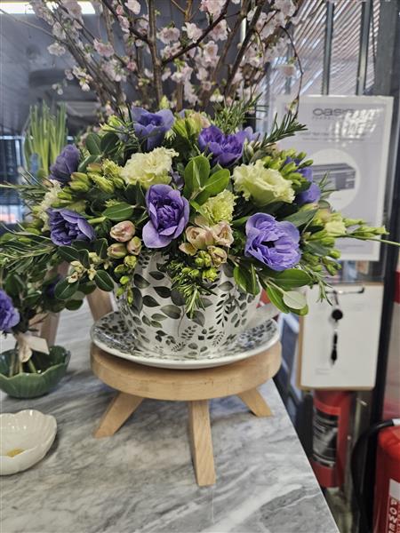 A beautifully curated selection of seasonal flowers in soothing pastel tones, artfully arranged in a ceramic pot adorned with leafy detailing. This elegant piece is perfect for Mother’s Day, offering a lasting impression of warmth, gratitude, and affection.