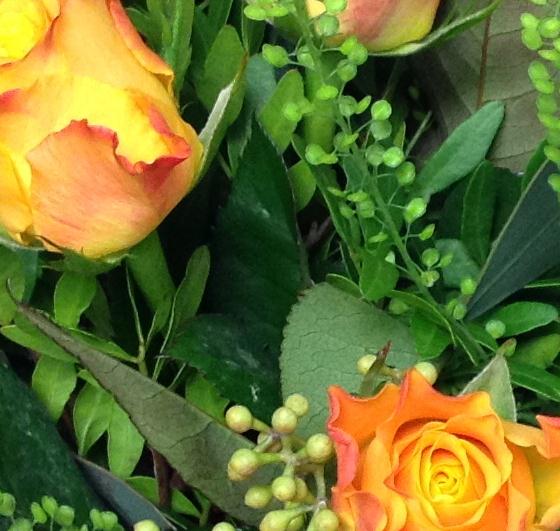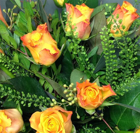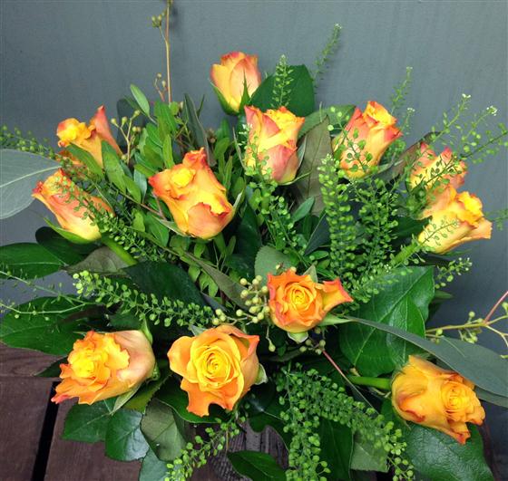 A dozen golden orange roses combined with contemporary foliage. Perfect as an autumnal gift.