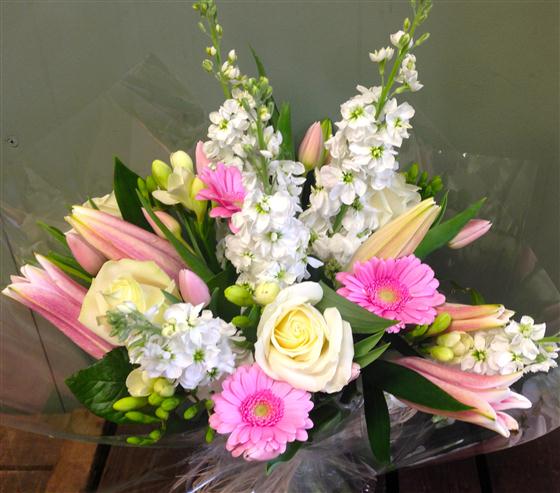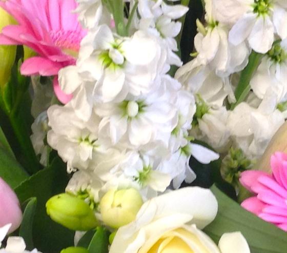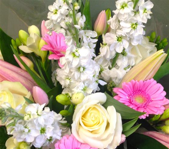 Beautiful combination of soft pastel shades. Freesias and stocks give a lovely fragrance to this pretty selection.